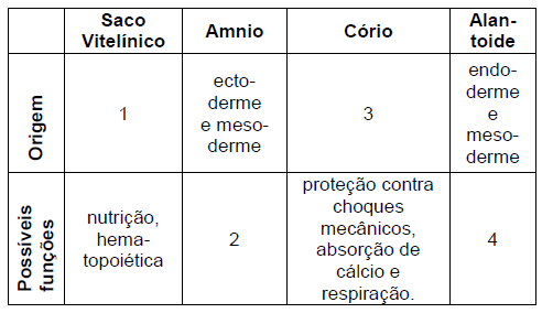(Cesmac/2014-2) Os anexos embrionários abaixo são observados em alguns grupos de vertebrados. Sobre esses anexos, analise o quadro abaixo e assinale a alternativa que preenche corretamente os espaços indicados por 1, 2, 3 e 4.