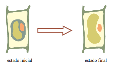 (UEA) O desenho mostra uma célula vegetal que foi mergulhada em uma solução salina cuja concentração era menor que o meio intracelular. Após certo tempo, a célula ganhou água, havendo um aumento significativo do volume vacuolar.