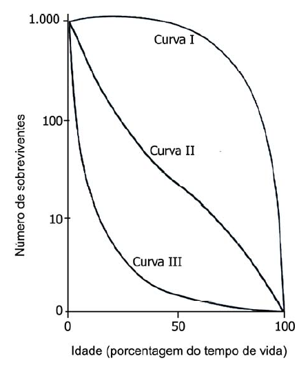 (UFRGS/2013) A figura abaixo apresenta três padrões hipotéticos de curvas de sobrevivência, frequentemente encontrados na natureza.