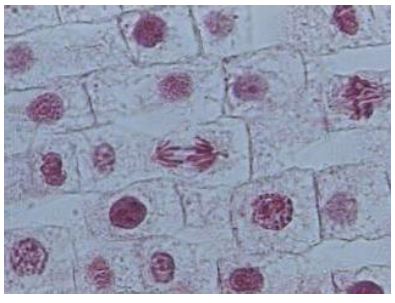 Elevada quantidade de células em divisão celular (mitose): A imagem mostra claramente várias células em diferentes fases da mitose (cromossomos visíveis e organizados). Esta é a característica mais importante, pois indica que o tecido está em intensa proliferação, ou seja, é uma região de crescimento ativo.
