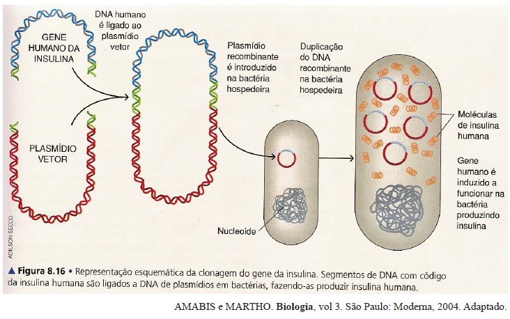 (UEMG) Analise as informações contidas na imagem a seguir, que mostra a produção de insulina por uma bactéria.